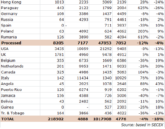 第二個主要目的地是智利,有近10000噸,其中近80%是冰鮮的的。緊隨其后的是菲律賓,出口量達(dá)到5278噸。