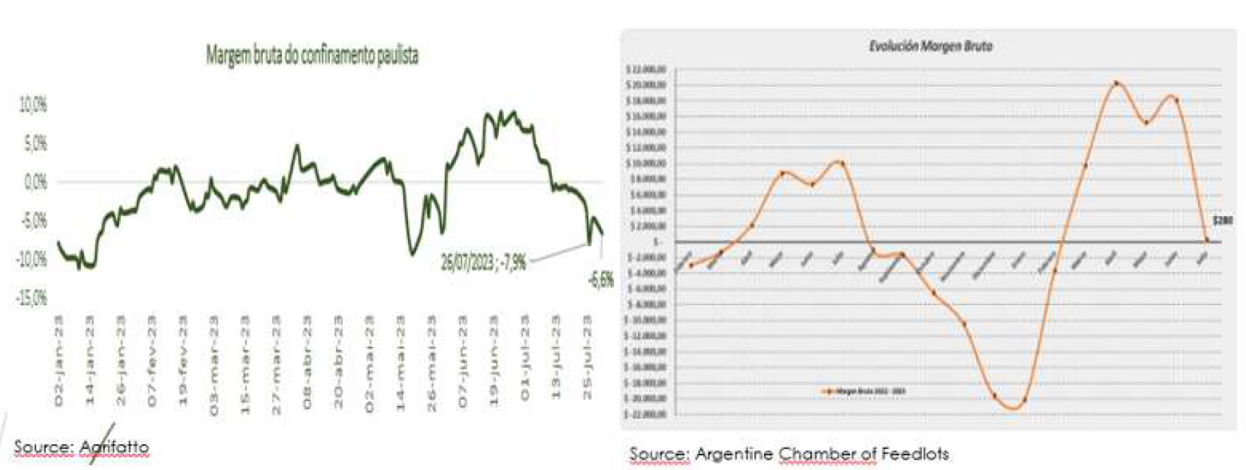一位分析師稱,適合出口到中國(guó)的??赡軙?huì)減少,但無(wú)論如何,供應(yīng)都不會(huì)減少,飼養(yǎng)場(chǎng)的牛數(shù)量將達(dá)到700萬(wàn)頭。在圣保羅,飼養(yǎng)場(chǎng)7月份的數(shù)字為負(fù)數(shù),26日達(dá)到7.9%。盡管玉米價(jià)格明顯下降,牛的價(jià)格保持相對(duì)較低,被送往屠宰場(chǎng)牛的價(jià)格下跌使數(shù)字變紅。阿格里法托說(shuō):“隨著10月23日育肥牛的價(jià)格將降至249雷亞爾/15公斤以下,超過(guò)了過(guò)去60天16%的成本下降,飼養(yǎng)場(chǎng)毛利率顯示負(fù)數(shù)。因此,預(yù)計(jì)10月和11月屠宰的動(dòng)物數(shù)量會(huì)減少是合理的。