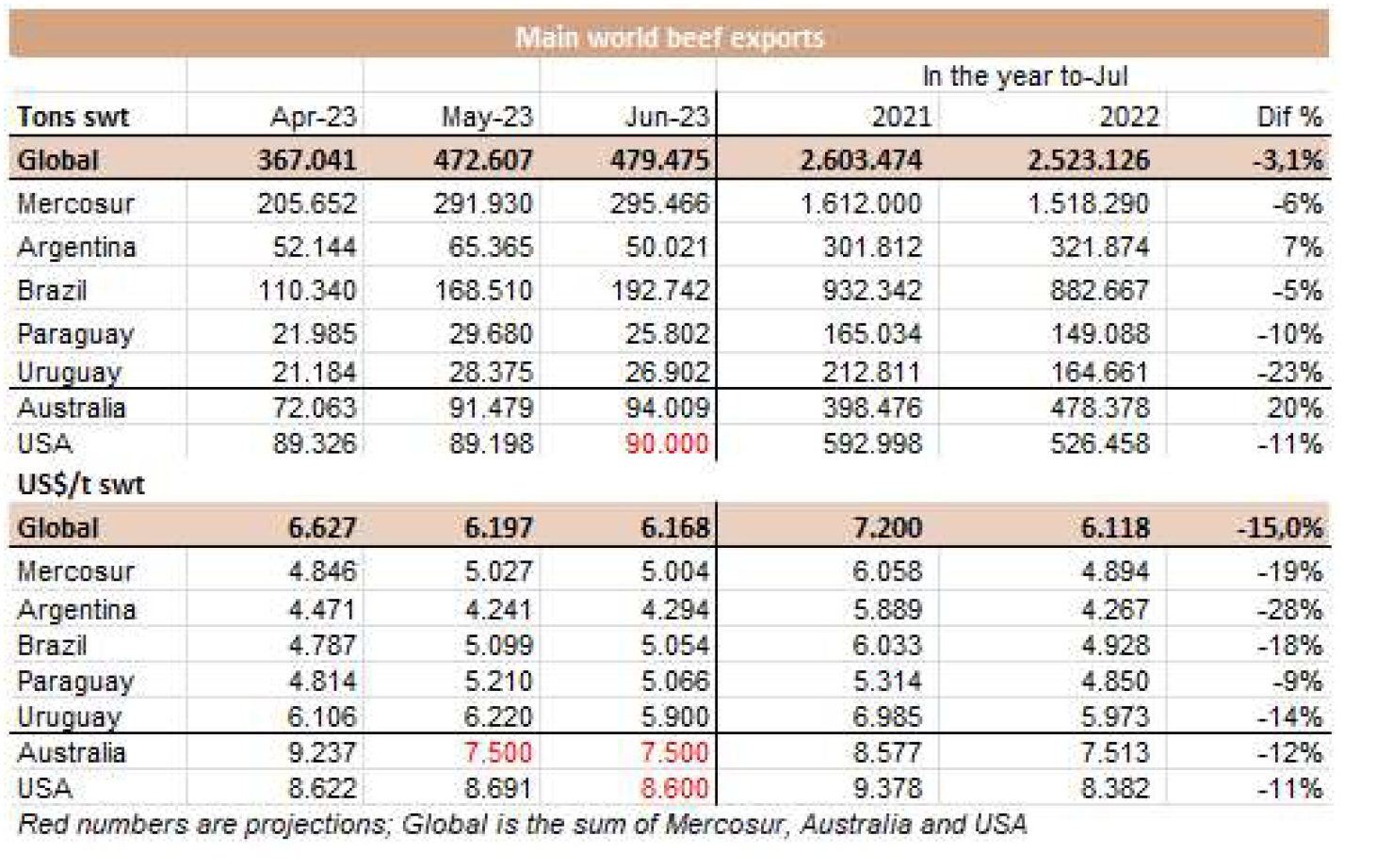 根據(jù)外貿(mào)部(SECEX)的信息,巴西7月份出口了160795噸牛肉,平均價(jià)值為4740美元/噸。與6月份相比,產(chǎn)量減少了近3.2萬(wàn)噸,但同比僅減少了6.5萬(wàn)噸。平均出口價(jià)格在月度比較中下降6.2%,在年度比較中下降27.6%。因此,與去年同月相比,巴西的出口量在5月和6月出現(xiàn)了復(fù)蘇。今年至7月份,巴西出口了104萬(wàn)噸牛肉,比2022年同期減少了5.6萬(wàn)噸(-5.1%);與每噸4899美元相比,平均出口價(jià)格下降了20%。