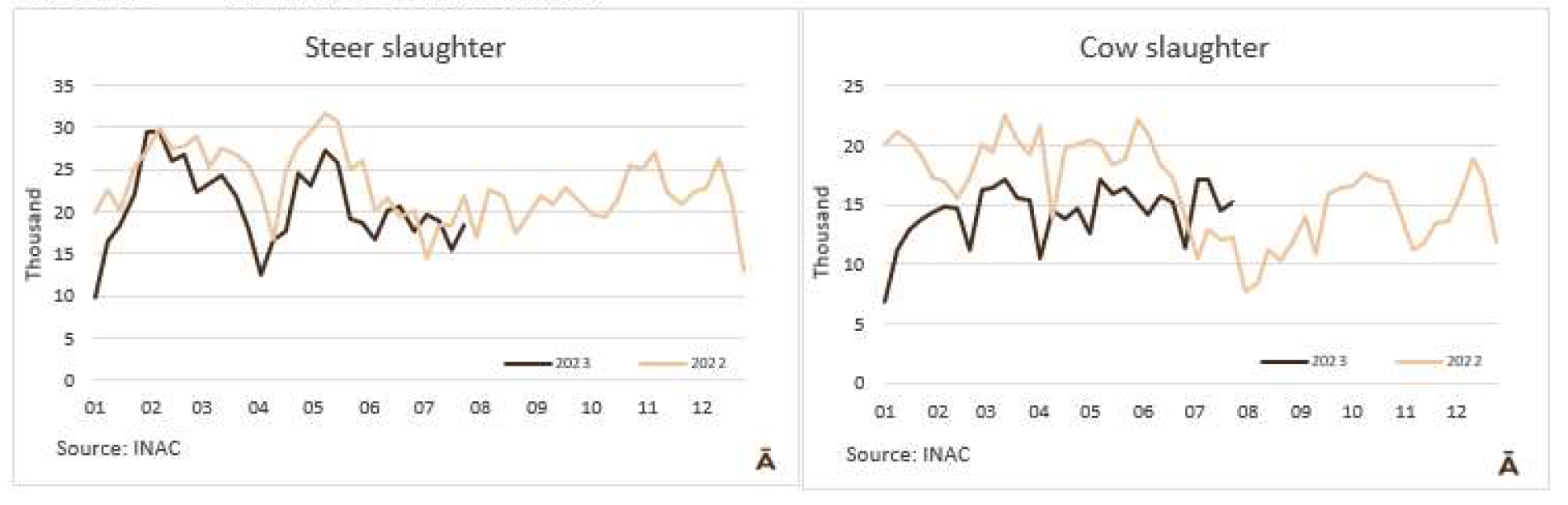 根據(jù)SENASA臨時(shí)數(shù)據(jù),7月份的屠宰許可包括129萬(wàn)頭牛,比前一個(gè)月減少了1%,但是比一年前增加了14%。年度增幅最大的品種是小母牛(26%),其次是奶牛(19%)和幼牛(16%),對(duì)公牛的屠宰沒(méi)有改變。與5月和6月的比例一致,7月母牛屠宰比例為48.7%,比去年同月增加了三個(gè)百分點(diǎn)。