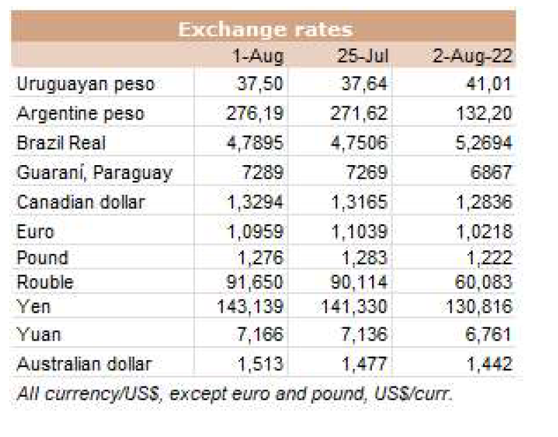 盡管上周(因雪關(guān)閉后)約700輛載有牛肉的卡車進(jìn)入了智利邊境(通常在15天內(nèi)進(jìn)入)。一位進(jìn)口商在與WBR對(duì)話時(shí)表示:“這種肉的管理和分銷速度非??臁!痹谶@種情況下,人們預(yù)計(jì)9月的國(guó)定假日會(huì)有一個(gè)銷量。該知情人士稱:“假期臨近時(shí),價(jià)格可能會(huì)上漲一點(diǎn)?!熬蜑趵缗?span>19-20分體來(lái)講,具體取決于切割和品牌的定價(jià)為5300-5500美元/噸之間”。與此同時(shí),巴拉圭一家出口商報(bào)告稱,該公司8月份完成了5600-5700美元的貨物交易?!昂?jiǎn)而言之,看起來(lái)非常不確定的前景開始明朗起來(lái),”這位消息人士表示。