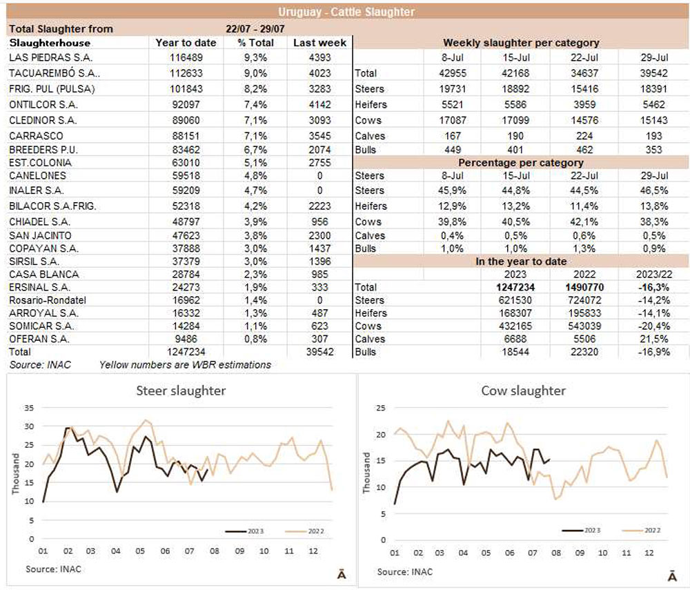 牛的屠宰量連續(xù)兩周保持在40000頭以下。INAC報(bào)告稱,在截至7月29日的一周內(nèi),有39542頭牛進(jìn)入工廠,比前一周(由于7月18日假期)多了近5000頭,但比去年同期減少了2%。隨著481配額活動(dòng)的開始,被屠宰的公牛和小母牛的比例有所增加,而奶牛的比例有所下降。與前一周相比,公牛增加了19%達(dá)到了18391頭,小母牛增加了38%達(dá)到5462頭,而奶牛只增加了4%,數(shù)量為15143頭,占屠宰總數(shù)的38%,比前一周減少了4個(gè)百分點(diǎn)。屠宰量最多的工廠為Las Piedras(4393)、Ontilcor(4142)和Marfrig-Tacuarembo(4023)。Marfrig屠宰量是9871頭(每周增加13%),而其他兩個(gè)工廠屠宰了6828頭牛(每周減少4%)。今年7月有161731頭牛被屠宰,去年7月只有149300頭牛被屠宰,因此年度比較有所增加,這是前13個(gè)月沒(méi)有發(fā)生過(guò)的