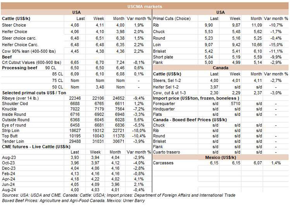 一位貿(mào)易商表示,在大洋洲(新西蘭和澳大利亞)大量牛肉供應(yīng)占主導(dǎo)地位的情況下,美國(guó)進(jìn)口市場(chǎng)并沒(méi)有表現(xiàn)出很大的變化。烏拉圭配額內(nèi)牛前部位肉90CL的參考價(jià)格為FOB 4550美元每噸。