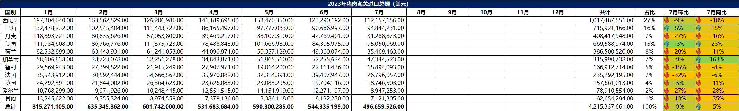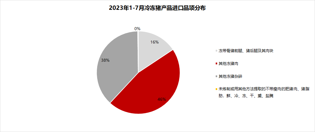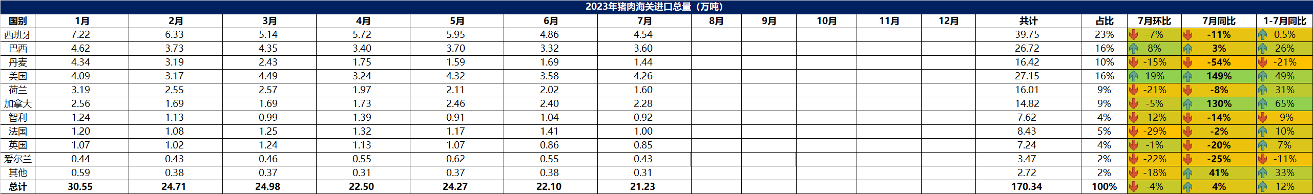 2023年7月中國主港豬肉進口量21.23萬噸,環(huán)比減少4%,同比增加4%。進口金額4.96億美元,環(huán)比下降9%,同比上漲5%。1-7月中國主港豬肉進口總量170.34萬噸,同比增加12%。進口總額42.15億美元,同比增長27.9%。從進口國別看,1-7月,從西班牙進口豬肉總量39.75萬噸,占進口總量的23%,同比減少11%。從美國進口豬肉27.15萬噸,占比16%,超過巴西成為中國主港豬肉進口第二大來源國,同比增加149%。從巴西進口豬肉26.72萬噸,占比16%,同比增加3%。從丹麥進口豬肉16.42萬噸,占比10%,同比減少54%。從荷蘭進口豬肉16.01萬噸,占比9%,同比減少8%。從加拿大進口豬肉14.82萬噸,占比9%,同比增長130%。中國主港進口豬肉區(qū)域分布發(fā)生明顯變化,從歐洲進口豬肉數(shù)量同比均有大幅減少,而從美國和加拿大進口豬肉數(shù)量同比增長驚人。從進口品項看,1-7月,進口其他凍豬肉78.73萬噸,占比46%。進口其他凍豬雜碎64.59萬噸,占比38%。主塊肉和油脂類進口量分別26.64萬噸和0.35萬噸,兩個品項進口量之和占比16%。