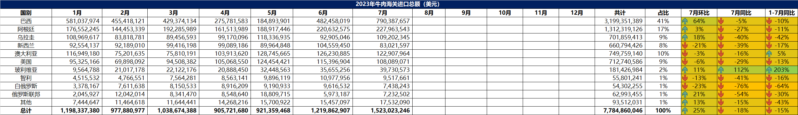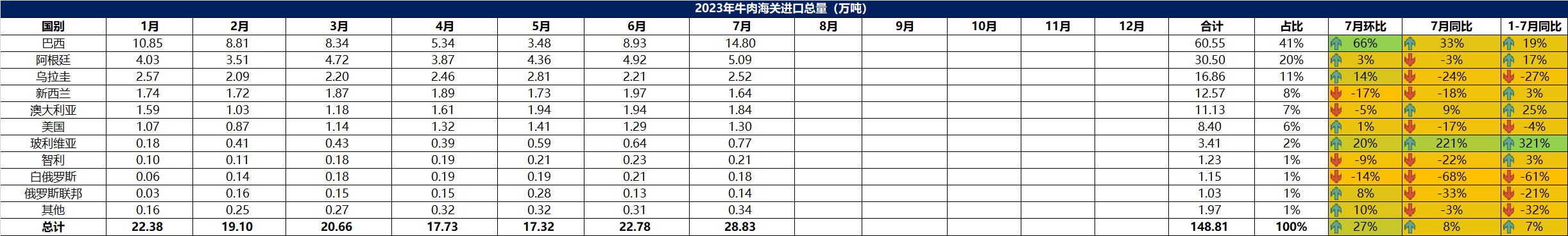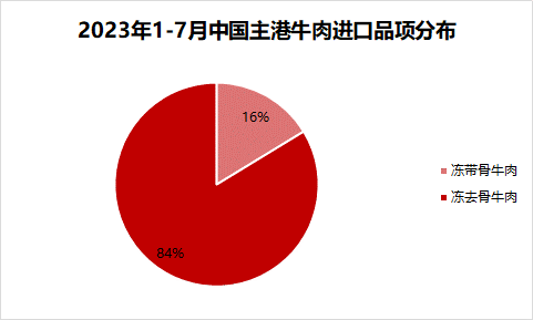 2023年7月中國主港牛肉進口量28.83萬噸,環(huán)比增長27%,同比增長8%。進口金額15.23億美元,環(huán)比增長25%,同比下滑18%。1-7月中國主港牛肉進口總量148.81萬噸,同比增長7%。進口總金額77.84億美元,同比下滑15%。從進口國別看,1-7月,從巴西進口牛肉數(shù)量60.55萬噸,同比增長19%,占進口總量的41%。從阿根廷進口牛肉數(shù)量30.50萬噸,同比增長17%,占比20%。從烏拉圭進口牛肉數(shù)量16.86萬噸,同比減少27%,占比11%。從新西蘭進口牛肉數(shù)量12.57萬噸,同比增長3%,占比8%。從澳洲進口牛肉數(shù)量11.13萬噸,同比增長25%,占比7%。玻利維亞牛肉自去年4月暫停牛肉出口,于去年11月恢復牛肉出口,因此今年1-7月從玻利維亞進口牛肉同比增長321%。從進口品項看,1-7月,中國主港進口凍帶骨牛肉24.23萬噸,進口凍去骨牛肉124.57萬噸。