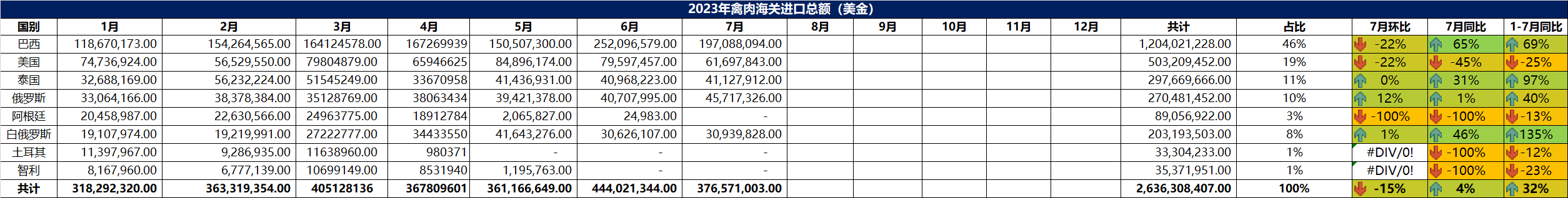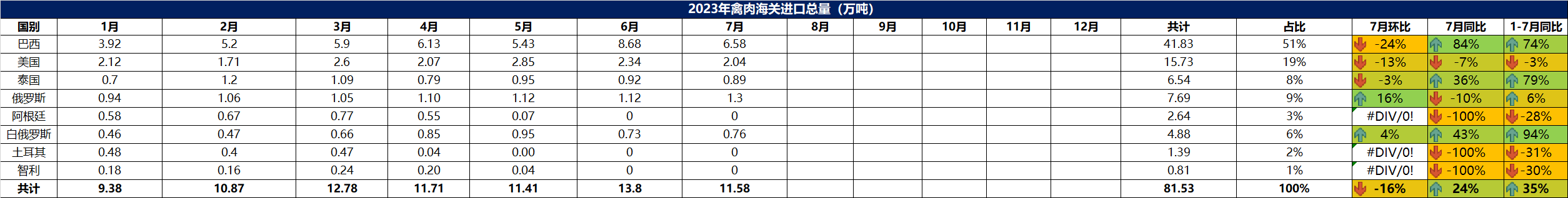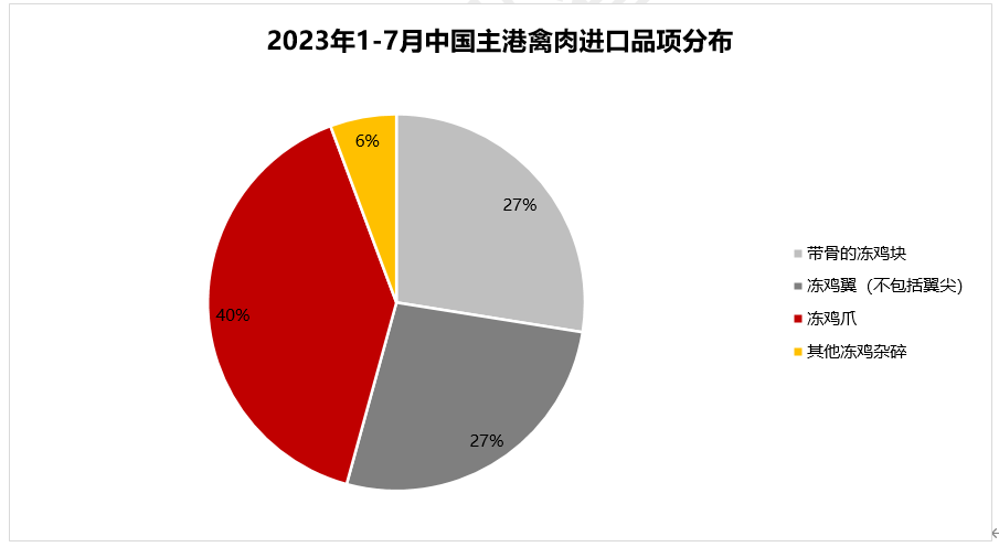 2023年7月中國主港進口禽肉數(shù)量11.58萬噸,環(huán)比減少16%,同比增長24%。進口金額3.76億美元,環(huán)比下滑15%,同比上漲4%。1-7月,中國主港進口禽肉共計81.53萬噸,同比增長35%。進口總額26.36億美元,同比增長32%。從進口國別看,1-7月,從巴西進口禽肉41.83萬噸,同比增長74%,占比51%。從美國進口禽肉15.73萬噸,同比減少3%,占比19%。從俄羅斯進口禽肉7.69萬噸,同比增長6%,占比9%。從泰國進口禽肉6.54萬噸,同比增長79%,占比8%。從進口品項看,凍雞爪進口總量32.67萬噸,占比40%。帶骨的凍雞塊進口總量22.454萬噸,占比27%。凍雞翼(不包括翼尖)進口總量21.80萬噸,占比27%。其他凍雞雜碎進口總量4.64萬噸,占比6%。