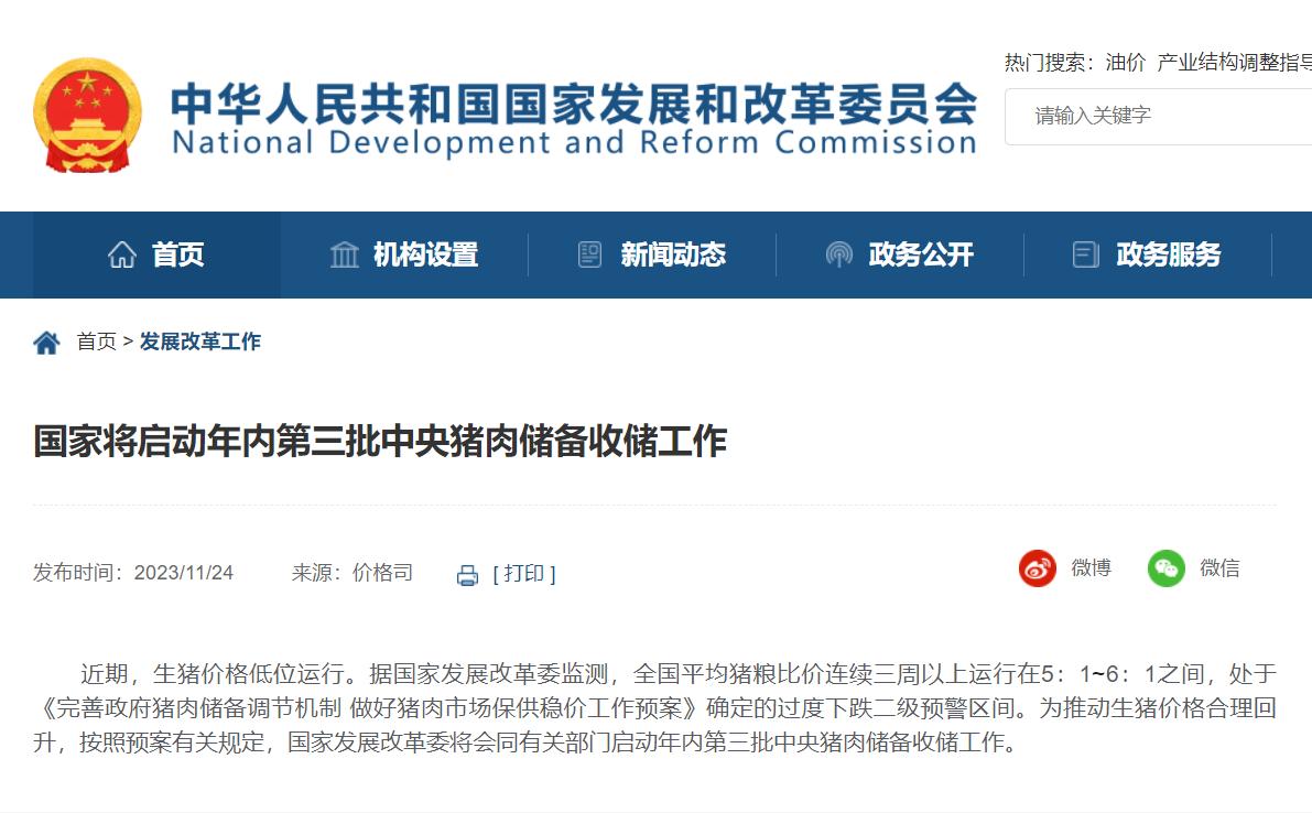近期,生豬價格低位運行。據(jù)國家發(fā)展改革委監(jiān)測,全國平均豬糧比價連續(xù)三周以上運行在5:1~6:1之間,處于《完善政府豬肉儲備調(diào)節(jié)機制 做好豬肉市場保供穩(wěn)價工作預(yù)案》確定的過度下跌二級預(yù)警區(qū)間。為推動生豬價格合理回升,按照預(yù)案有關(guān)規(guī)定,國家發(fā)展改革委將會同有關(guān)部門啟動年內(nèi)第三批中央豬肉儲備收儲工作。