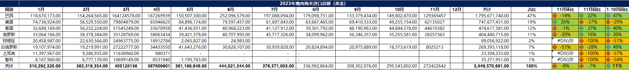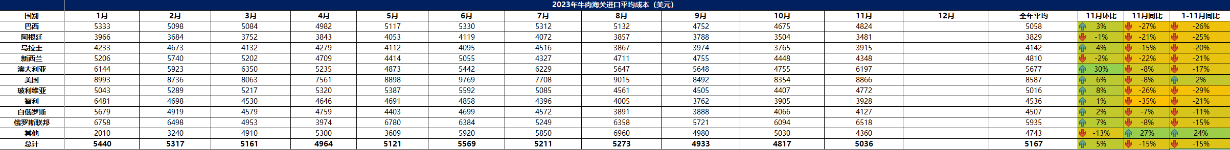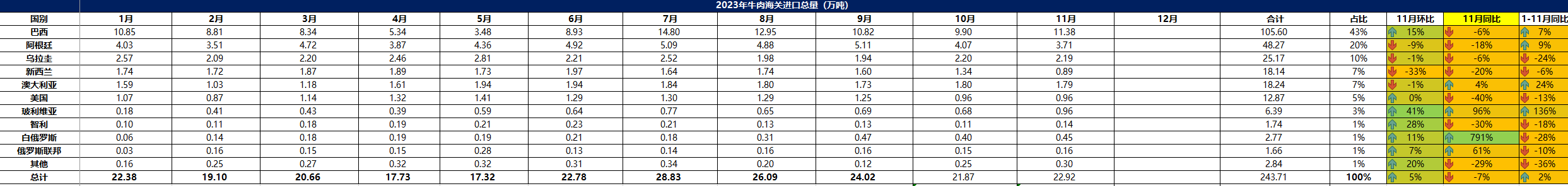 2023 年 11月中國主港牛肉進口量22.92萬噸,環(huán)比上升5%,同比減少 7%。1-11月, 中國主港牛肉進口總量 243.71萬噸,同比增加 2%。從進口國別看,進口巴西牛肉105.6萬 噸,同比下降6%,占比 43%。進口阿根廷牛肉48.27萬噸,同比增加 9%,占比 20%。進口烏拉圭牛肉25.17萬噸,同比減少6%,占比 10%。進口新西蘭牛肉 18.14萬噸,同比下降20%,占比 7%。進口澳大利亞牛肉 18.24萬噸,同比增加24%,占比 7%。從進口品 項看,凍去骨牛肉進口總量203.89萬噸,占比 84%。凍帶骨牛肉進口總量 39.81萬噸,占比 16%。從進口金額看,1-11月,中國主港牛肉進口金額共計 139.27億美金,同比減少 2%。其中,巴西牛肉進口金額 61.74億美金,同比持平。阿根廷牛肉進口金額22.33億美金, 同比持平。澳大利亞牛肉進口金額13.53億美金,同比增加11%。烏拉圭牛肉進口金額11.22 億美金,同比減少 30%。新西蘭牛肉進口金額9.79億美金,同比減少17%。