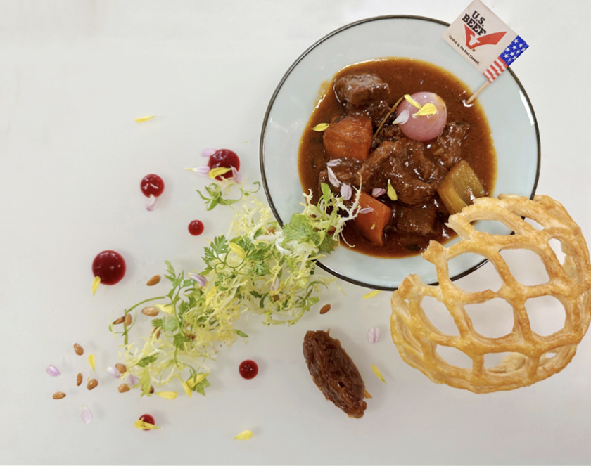 做法:將牛肩胛翼板肉切大塊,用鹽、黑胡椒腌制,煎至上色備用;香菇塊煮軟,與洋蔥丁、芹菜丁、胡蘿卜丁、小干蔥一同放入牛肉鍋中;將大蒜、迷迭香、百里香、八角、丁香、肉豆蔻一同煮至大蒜變軟,加入牛肉鍋中;烤番茄醬至酸味明顯,放入牛肉鍋中,倒入紅酒、雞湯,煮至牛肉變軟、紅酒揮發(fā)、醬汁變稠,裝盤;將蜘蛛菜心、香菜苗、薄荷、松子加橄欖油、鹽、黑胡椒拌勻成松子香料沙拉,與燉好的牛肩胛翼板肉一同擺盤,點綴酥皮網(wǎng)、洋蔥醬即可。