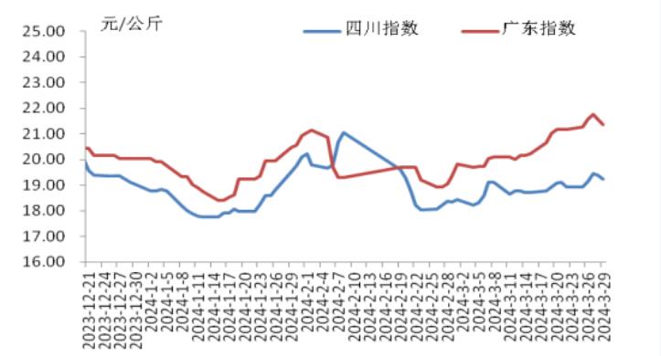 本周,廣東豬肉周均價(jià)為每公斤21.51元,環(huán)比上漲2.2%,同比上漲5.4%,同比漲幅擴(kuò)大4.4個(gè)百分點(diǎn)。廣東地區(qū)散養(yǎng)戶出欄生豬的節(jié)奏較穩(wěn)定,受北方行情上漲影響,部分散養(yǎng)戶和規(guī)模養(yǎng)殖看漲情緒偏濃,提高生豬出欄價(jià)格,加之家庭消費(fèi)好轉(zhuǎn),豬肉經(jīng)銷商采購(gòu)意愿較強(qiáng),帶動(dòng)豬肉需求短時(shí)小幅增加。供需雙向促使本周廣東地區(qū)豬肉周均價(jià)環(huán)比上漲。