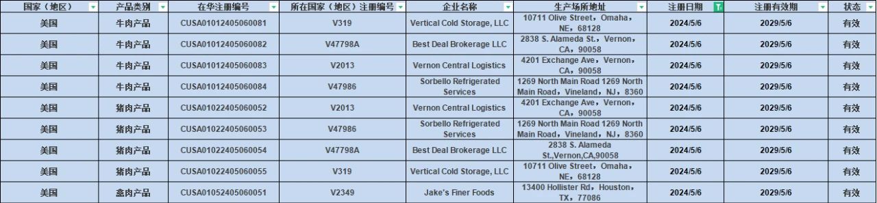 2024年5月6日新增美國9家肉類產品企業(yè),其中: