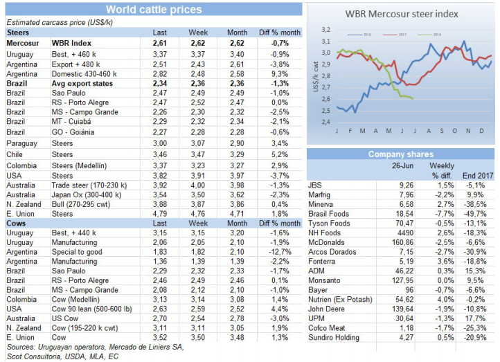 育肥牛市場各州的表現(xiàn)不同,圣保羅前幾周牛價保持不變,140亞雷爾,北部由于供應(yīng)短缺牛價上漲,其他州由于廠家和農(nóng)場銷售協(xié)議快到截止日期還未達(dá)成,廠家處于壓價的有利位置。國內(nèi)批發(fā)市場需求不高,庫存沒有得到消耗,導(dǎo)致零售價格降低。預(yù)期七月初因為國內(nèi)需求增加活牛價格會增長。