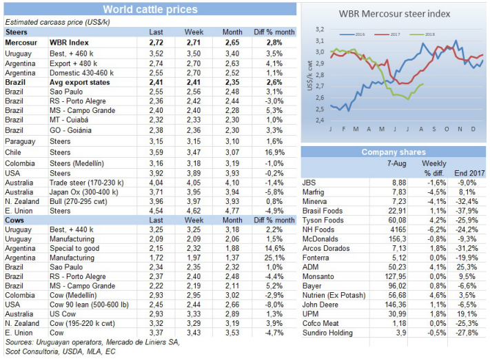 阿根廷閹牛價(jià)格再度上漲,自五月初以來阿根廷比索結(jié)算價(jià)增加了18%,美金價(jià)格也從去年十一月最低的2.43漲到2.74美金,漲幅13%,本周貨幣保持穩(wěn)定,本地牛價(jià)上漲使美金價(jià)格增加了4美分。烏拉圭牛價(jià)穩(wěn)中有升,本周3.52美金,近三年最高。巴西本地牛價(jià)有所上漲,但美金價(jià)穩(wěn)定在2.41美金,巴拉圭牛價(jià)也保持不變。本周南方共同市場(chǎng)閹牛指數(shù)漲了1美分至2.72美金。
