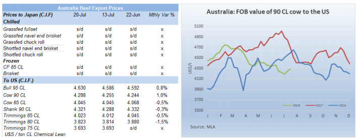 中國市場沒有活躍的跡象,不確定這一過程會持續(xù)多久,中國進口商想還跟匯率上漲之前一樣的人民幣價格,把匯率上漲的成本轉(zhuǎn)嫁給出口商,因此還價折換成美金非常低,很難成交。比如全牛前報盤3100,還盤2900,90機測牛前報3900,還3550。美金人民幣匯率從展會時的6.3漲到現(xiàn)在的6.9,意味著成本上升了15%,八月對今年的市場發(fā)展趨勢非常關(guān)鍵。此外水漂貨走量和價格也很疲軟,巴西腱子甚至不超過3600。