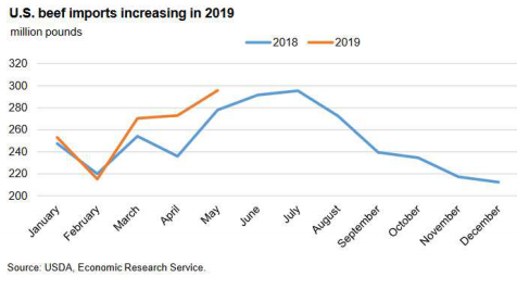 根據(jù)USDA最新預(yù)測,明年美國牛肉和豬肉進(jìn)口量會減少,羊肉進(jìn)口量保持不變,大洋洲由于天氣原因存欄減少,牛肉供應(yīng)量持續(xù)減少,預(yù)計(jì)美國牛肉進(jìn)口量會減少3%,由于中國市場非洲豬瘟導(dǎo)致的高需求,以及全球豬肉供應(yīng)減少,美國豬肉進(jìn)口量預(yù)計(jì)會減少4%,美國國內(nèi)牛肉和豬肉產(chǎn)量分別會提高1.1%和2.8%,也減少了對進(jìn)口肉的需求。2019年美國牛肉進(jìn)口量增加,五月進(jìn)口量達(dá)到2.96億磅,同比增加6%,除了新西蘭外其他國家對美國出口量都增加,其中澳洲前五個月出口量同比增加14%,主要因?yàn)榻衲晟习肽臧闹尥涝琢吭黾印?span>