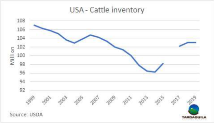 7月1日所有活牛和牛犢存欄量1.03億頭,和去年同期相同,年中牛犢存欄3630萬頭,上半年共出生2650萬頭小牛犢,下半年預(yù)計(jì)會出生980萬頭小牛犢。所有母牛和小母牛存欄4170萬頭,其中肉母牛3240萬頭,母奶牛930萬頭。