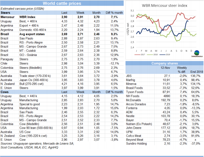 巴西育成牛按雷亞爾計算堅挺,但雷亞爾貶值的影響超過價格本身,因此受雷亞爾貶值將近5%的影響,南方市場閹牛價格指數(shù)本周下跌1美分,胴體價格跌至2.9美元/公斤。巴西老公牛價格按雷亞爾計算上漲3.9%,但雷亞爾貶值帶來的影響更大,在主要的出口州老公牛平均價格下跌2美分,下跌至2.69美元/公斤。南共市的其他國家價格變化不大,烏拉圭價格仍然穩(wěn)定,遠(yuǎn)比其他國家參考價格高,胴體價格4.33美元/公斤。阿根廷胴體價格2.47美元/公斤。巴西