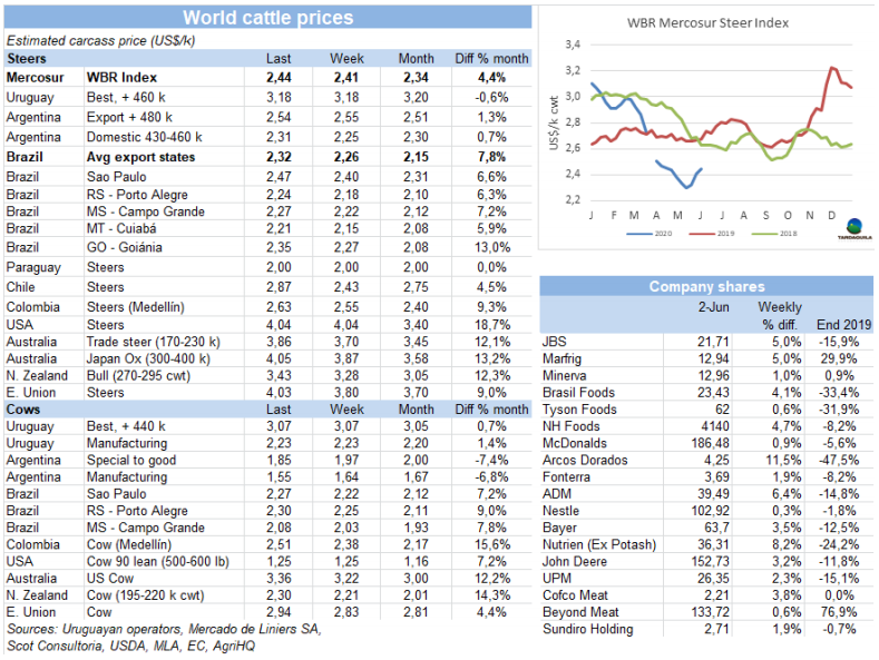盡管美國疫情嚴(yán)重,美國市場仍有需求。據(jù)透露,阿根廷90CL牛前成交價(jià)5100美元/噸離岸價(jià)。烏拉圭方面主要的障礙是配額不足。事實(shí)上,上周烏拉圭向美國出口牛肉1023噸,這一速度是不可持續(xù)的,因?yàn)殛P(guān)稅優(yōu)惠的配額是2萬噸。今年烏拉圭的總出口量已達(dá)7179噸,比去年同期增長9.5%