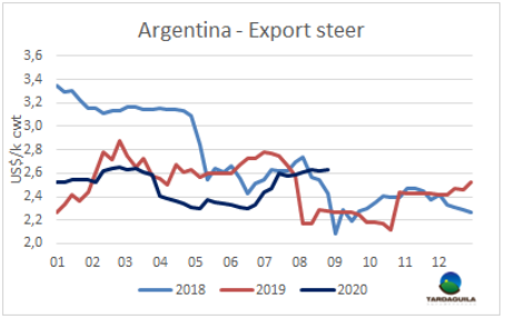 下周猶太屠宰季即將結束。猶太屠宰季始于6月,在阿根廷外交部和以色列大使館的共同努力下,牛肉加工機構設法將猶太潔食的工作人員從以色列包機帶回。屠宰隊將在猶太新年結束工作,目前還不清楚他們什么時候能回來。因此,牛犢的貿易在一個月到一個半月之內將退出游戲。這使工廠面臨的情況更加復雜,閹牛價格上漲,國內市場低迷,希爾頓配額價格由于新冠疫情的再次出現和需求的疲軟而下跌,美國配額用盡,中國市場僅有貨值低的部位需求且價格上漲緩慢。