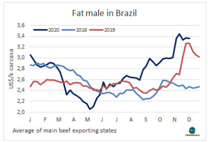 隨著零售購買需求逐漸疲軟,育成牛價(jià)格和批發(fā)市場(chǎng)肉價(jià)繼續(xù)下跌。盡管11月出口市場(chǎng)尤其是中國市場(chǎng)的需求很好,但國內(nèi)市場(chǎng)需求仍然很慘淡,即使是月初也沒有任何恢復(fù)獲利的跡象。第三季度的經(jīng)濟(jì)數(shù)據(jù)良好,國內(nèi)生產(chǎn)總值在經(jīng)歷了前一季度疫情造成的急劇下滑后反彈了7.7%。如果GDP的復(fù)蘇鞏固,國內(nèi)需求應(yīng)該會(huì)對(duì)持續(xù)低迷的供應(yīng)做出反應(yīng)。本周牛價(jià)下跌了5雷亞爾/15公斤,圣保羅本周初育成牛成交價(jià)268雷亞爾/15公斤,已經(jīng)拉開了與11月中旬最高成交價(jià)290雷亞爾/15公斤的差距。預(yù)定時(shí)間拉長(zhǎng),全國平均預(yù)定時(shí)間約8天,圣保羅為9天。期貨市場(chǎng)價(jià)格仍在下跌,雷亞爾升值可能對(duì)出口商賣貨不利。