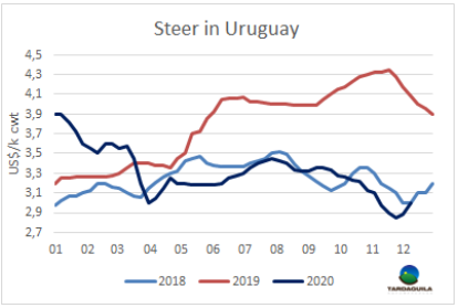近幾天育成牛市場(chǎng)價(jià)讓本就不多的供應(yīng)從市場(chǎng)退出,導(dǎo)致了愈發(fā)嚴(yán)重的短缺。預(yù)定時(shí)間縮短,閹牛價(jià)格回到了3美元/公斤。這是11月初以后一直沒能達(dá)到的價(jià)格。恰如預(yù)期,供應(yīng)較少。但價(jià)格的強(qiáng)勢(shì)回漲導(dǎo)致前期預(yù)定活牛卻沒有談價(jià)格的人決定不買了,因?yàn)槲磥韼字軆r(jià)格很可能會(huì)繼續(xù)保持堅(jiān)挺達(dá)到更高的水平。因?yàn)槭袌?chǎng)剛剛啟動(dòng),很難建立價(jià)格參考,同意牛種,不同工廠之間的差價(jià)可能達(dá)到15美分。工廠對(duì)所有牛種的采購興趣都很高,主要是母牛,主要目標(biāo)是中國市場(chǎng)。母牛成交價(jià)在2.8-2.9美元/公斤,閹牛參考價(jià)3美元/公斤,也有一些3.05美元/公斤的成交。預(yù)定時(shí)間縮短至7-10天。受供應(yīng)短缺影響,尤其是高質(zhì)量的牛短缺,預(yù)計(jì)市場(chǎng)將保持堅(jiān)挺。