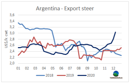 出口牛的價(jià)格在過去兩個(gè)月急劇上漲。漲勢(shì)最兇的是閹牛,尤其是英國純種閹牛,10月第一周和12月第一周之間增長(zhǎng)了31.6%。同期,印度串種閹牛價(jià)格上漲了27.7%。特優(yōu)母牛價(jià)格過去兩個(gè)月累計(jì)增長(zhǎng)23.6%,而主要銷往中國市場(chǎng)的工業(yè)母牛增長(zhǎng)了25.0%。兩個(gè)月前,市場(chǎng)分析師Victor Tonelli就預(yù)測(cè)到了牛價(jià)上漲,他指出,過冬犢牛的價(jià)格和飼養(yǎng)成本的比率比從飼養(yǎng)場(chǎng)出欄的活牛價(jià)格高出20%/25%,這使得養(yǎng)殖業(yè)無法生存,并導(dǎo)致了飼養(yǎng)場(chǎng)空置。