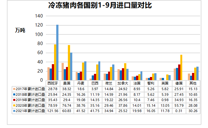 9月,中國主港豬肉進(jìn)口量30.86萬噸,環(huán)比減少19%,同比減少34%。1-9月,中國主港豬肉進(jìn)口量404.50萬噸,同比減少4%。進(jìn)口國別方面,西班牙仍是中國豬肉進(jìn)口第一大國,累計出口中國121.56萬噸,占中國豬肉進(jìn)口總量的30%。其次是美國、巴西、丹麥、荷蘭、加拿大、法國、智利、英國、愛爾蘭、墨西哥和奧地利。值得關(guān)注的是,巴西豬肉累計出口中國41.75萬噸,超過丹麥,成為中國豬肉進(jìn)口第三大國。