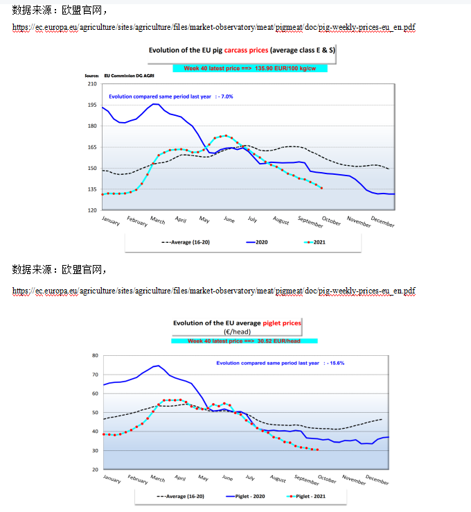 2021年歐盟9月豬胴體均價1.35歐元/kg,環(huán)比下滑4.8%,同比下滑7.09%。