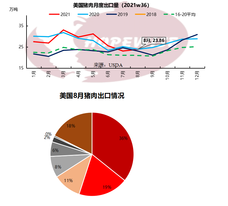 美國8月豬肉出口23.85萬噸,環(huán)比增加3.48%,同比減少0.25%。其中,出口墨西哥8.52萬噸,環(huán)比增加21.27%,同比增加50.41%,占8月美國豬肉出口總量的35.72%。墨西哥的后腿需求十分強(qiáng)勁。出口中國2.61萬噸,環(huán)比減少2.04%,同比減少49.23%,占比11%。中國本地豬肉鮮品價格便宜,凍品進(jìn)口需求持續(xù)疲軟,是出口中國下降的主要原因。出口日本4.60萬噸,環(huán)比增加3.04%,同比增加8.83%,占比19%。日本超過中國,成為美國豬肉出口第二大國。出口韓國1.34萬噸,環(huán)比減少26.13%,同比增加5.40%,占比6%。