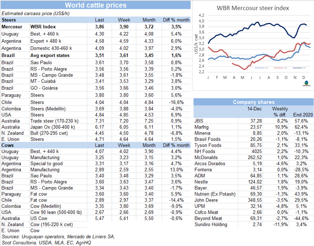 烏拉圭主要的屠宰包裝工廠決定在今年的剩余幾天減少活動(dòng),以應(yīng)對(duì)供應(yīng)收縮。美麗華已決定7廠于圣誕節(jié)前停工兩周,暫停申請(qǐng)?jiān)S可證,而Marfrig也將在Salto廠停工,暫停申請(qǐng)?jiān)S可證,盡管停工不超過(guò)10天。