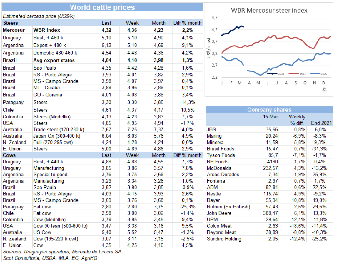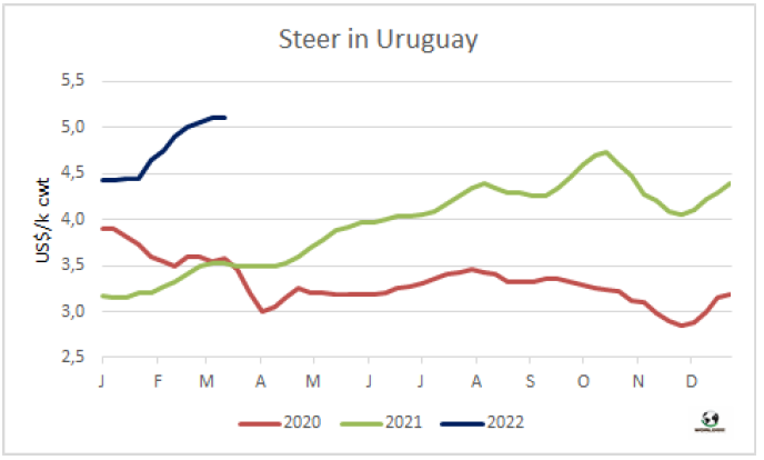 上周屠宰量受到24小時罷工影響。烏拉圭肉協(xié)統(tǒng)計截止3月12日當(dāng)周牛屠宰量51784頭,盡管屠宰量仍高于五萬頭,但較上周有10%的降幅,是今年以來首次屠宰量同比下降。閹牛屠宰量下降最為顯著,較上周下降了3715頭至25258頭。小母牛屠宰量下降了1645頭至5908頭,母牛屠宰量僅較上周下降了692頭至19327頭。屠宰活動最活躍的工廠是Las Piedras(379廠),屠宰量4894頭,Minerva Pulsa(7廠) 屠宰量3925頭, 其次是Minerva Canelones(8廠)屠宰量3892頭。Marfrig四家屠宰廠屠宰量12424頭,較上周下降了2920頭,美麗華三家屠宰場屠宰量11237頭,較上周減少了288頭。3月前12個工作日牛屠宰量共計99980頭,較2021年同期減少了0.4%,主要是閹牛屠宰量減少了5.3%,小母牛屠宰量減少了11.2%,母牛屠宰量增加了10.2%,閹牛中只有2-4顆齒閹牛屠宰量增長了7.1%。
