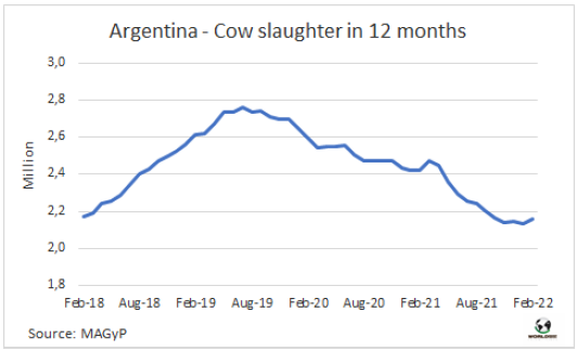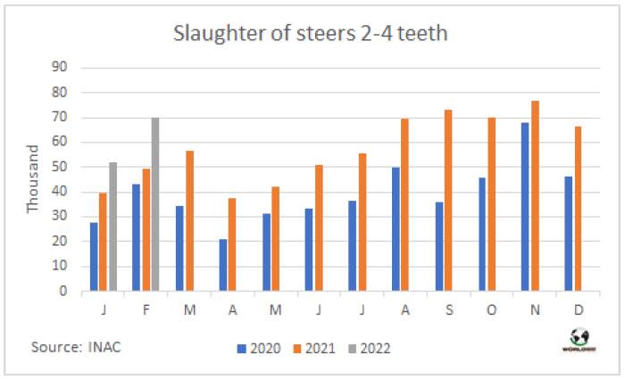 據(jù)農(nóng)業(yè)部估算,今年2月阿根廷牛肉產(chǎn)量23.2萬噸,2022年前兩個月產(chǎn)量合計45.4萬噸。單月看有所差異,但1-2月合計牛肉生產(chǎn)量與去年同期持平。2月人均消費量51公斤,1-月人均消費量48公斤,比2021年同期增長8%。