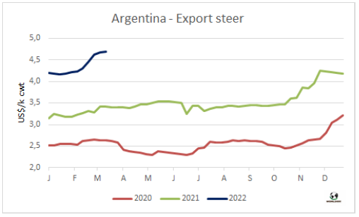 中國牛肉市場仍然活躍,盡管由進口商稱由于貿(mào)易商想加速貨物流轉(zhuǎn),價格開始下跌。近幾天工廠方面要價較高,加上中國的疫情情況,采購者都在觀望,不急采購。已經(jīng)成交的業(yè)務(wù)價格非常堅挺。巴西出口商稱需求端在等待,育肥牛價格強勁上漲,加上海運費上漲,期貨價格不會有下行。