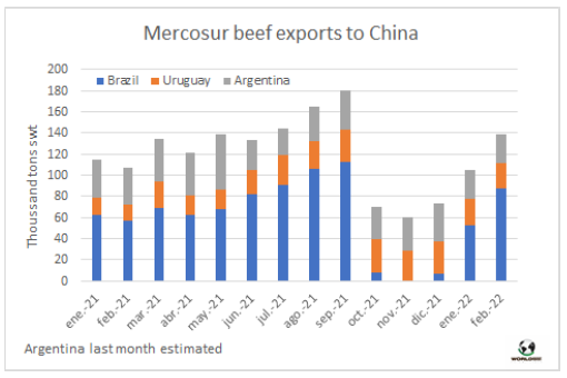 2月南方共同市場對中國牛肉出口量增長了3.萬噸