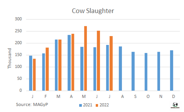 7月牛肉產(chǎn)量26.1萬噸,同比下降1.6%。7月人均消費量達(dá)45公斤/人/年,比一年前下降了5.4%。2022年到目前為止,由于平均屠宰重量的增加,牛肉產(chǎn)量已達(dá)180萬噸,比2021年同期增加了近4%。因此前7個月的人均消費量為46公斤/人/年。