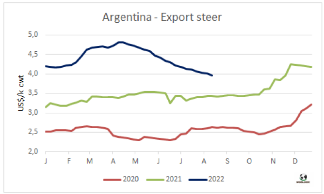 八月前十個工作日巴西出口量持續(xù)較大,出口價格下降。巴西外貿(mào)部報告前十個工作日巴西牛肉出口量達(dá)88806噸,平均出口價格6284美元/噸,平均出口價格較七月下降了4%,較六月的最高點下降了8%。如果保持前兩周的出口節(jié)奏,八月巴西牛肉出口量將達(dá)20萬噸,較2021年八月增加超2萬噸,也將創(chuàng)歷年八月出口量最高記錄。