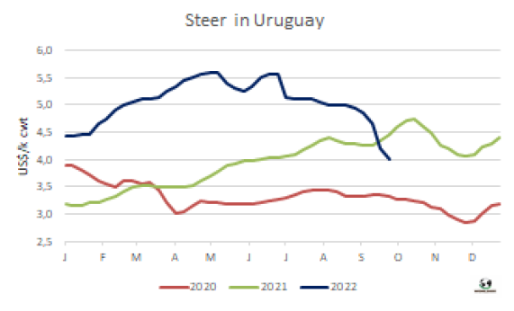 待宰牛價(jià)格本周再次下跌,盡管一些跡象表明,這一趨勢可能會逆轉(zhuǎn),市場可能會實(shí)現(xiàn)新的平衡。本周初的買入價(jià)與上周末相同,這是前幾周沒有發(fā)生的。工廠的訂購期約為15天。其中一位被咨詢的收貨人表示:“育肥牛被賣掉了,供應(yīng)就下降了。”目前市場仍然疲軟,價(jià)格下行,市場可能將在目前的參考價(jià)水平上達(dá)到新的平衡。一些工廠仍不出價(jià),另一些給重型閹牛出價(jià)3.9-4美元/公斤,母牛出價(jià)3.6-3.8美元/公斤,上周末,這一價(jià)格有一些成交。沒有賣出去的閹牛被迫出欄,有一些體重非常大,以草飼牛的價(jià)格成交。關(guān)于降雨量少的擔(dān)憂加重。未來幾天的降雨量預(yù)報(bào)不好,對拉尼娜年的預(yù)報(bào)也不樂觀,這意味著有很大可能降雨比正常情況下少。如果干旱情況沒有好轉(zhuǎn),可能會有額外的供應(yīng)壓力。昨晚,由于3名工人被解雇,在Frigocerro工廠發(fā)生沖突,肉類加工行業(yè)工人工會稱可能會進(jìn)行新的罷工。已經(jīng)在市場上停了幾周的工廠將不得不重新采購。潔食團(tuán)隊(duì)將會在11月初左右回到南美。輪流關(guān)閉工廠的巴西公司將恢復(fù)所有工廠的生產(chǎn)活動。因此,今年四季度供需將同步增加。