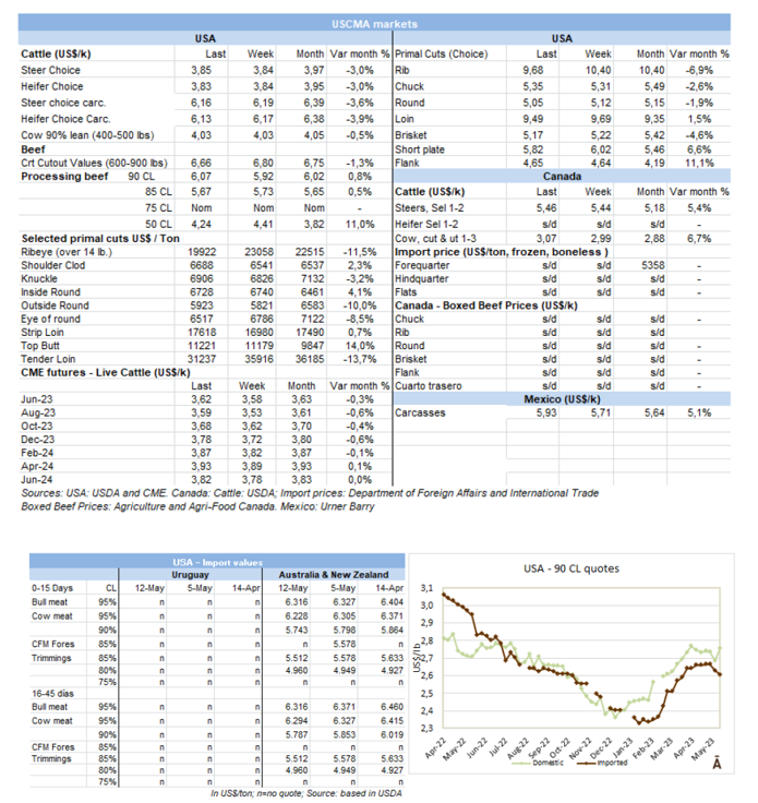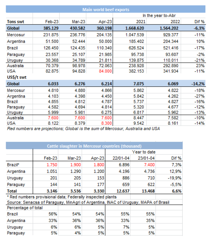 4月有117萬(wàn)頭牛被屠宰,這一數(shù)字比3月低9%,比2022年4月高11%。按營(yíng)業(yè)日計(jì)算,4月份的屠宰量達(dá)到每天65,100頭牛,比上個(gè)月高10.6%,比一年前高17.6%。而且,根據(jù)ABC出口商商會(huì)的說(shuō)法,這至少是過(guò)去四年來(lái)的最高值。