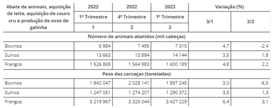 2023年第一季度的第一批生產(chǎn)結(jié)果表明,與2022年同期相比,雞的屠宰量增長(zhǎng)了4.8%,牛的屠宰量增長(zhǎng)了4.7%,豬的屠宰量增長(zhǎng)了3.5%。根據(jù)巴西地理統(tǒng)計(jì)局的數(shù)據(jù)顯示,與2022年第四季度相比,雞的屠宰量增加了2.2%,牛減少了2.4%,而豬肉增長(zhǎng)了1.8%。