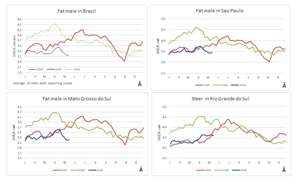 本周開始,圣保羅的肥牛價(jià)格所有下降,但在周末時(shí)穩(wěn)定下來(lái)。目前的情況是供應(yīng)良好,商家不多但屠宰量穩(wěn)定。