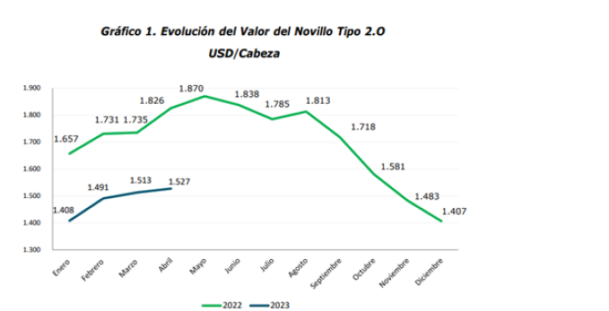 2023年4月,牛的價(jià)值增加了6.1美元,達(dá)到1,242美元/頭。就其本身而言,工業(yè)附加值比上個(gè)月(285美元)減少了58美元/頭。