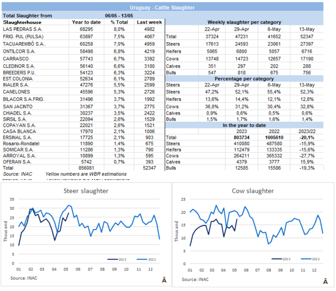 每周的屠宰量排名由Frigorífico Las Piedras(4,982頭)、Frigorífico