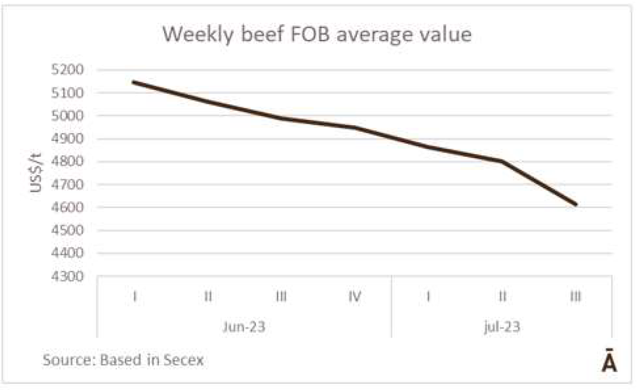 根據(jù)外貿(mào)部(Secex)報(bào)告,7月第三周,巴西以每噸平均4613美元的價(jià)格出口了41000噸牛肉。與本月前兩周相比,成交量有所增長(zhǎng),而平均價(jià)格保持持續(xù)下降趨勢(shì)。與6月前6個(gè)工作日(六周前)相比,平均出口價(jià)格下降了10.3%,即532美元/噸。在7月的前15個(gè)工作日,巴西出口117590噸牛肉,本月的牛肉總量預(yù)計(jì)為16-16.5萬(wàn)噸,比6月減少了約3萬(wàn)噸。
