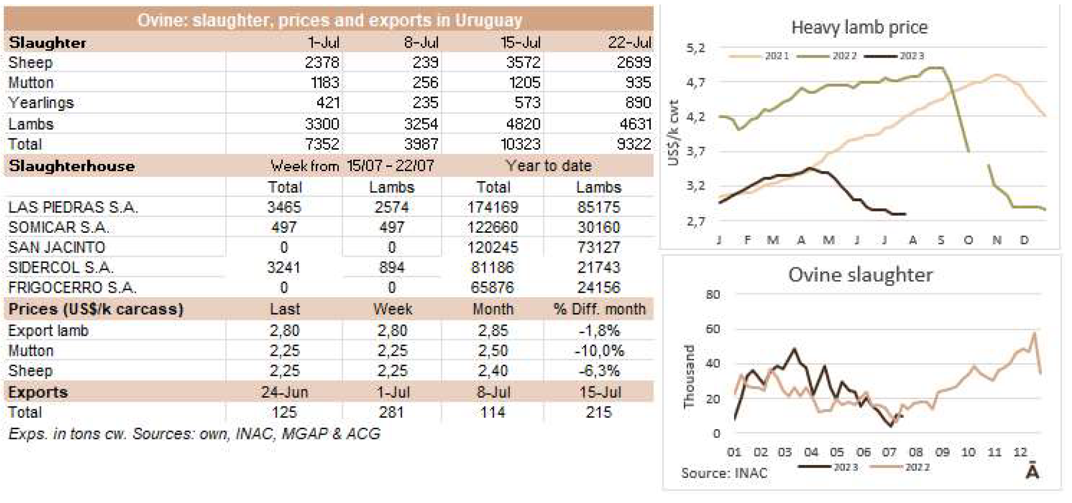由于7月18日的非工作假期,上周的牛屠宰量下降約7500頭,與去年非常相似(-1%)。INAC報(bào)告稱,有34637頭牛進(jìn)入工廠。奶牛周減少量為15%(14576頭),是減少比例最小的。奶牛屠宰量占總量的42.1%,是今年迄今為止的最高比例。另外15416頭公牛(周減少量為-18%)和3959頭小母牛(周減少量是29%)被屠宰。屠宰量最大的公司是Marfrig-Takuaremb6(3971),Minerva、Pulsa(3625)和Carrasco(3513)。Marfrig在一周內(nèi)屠宰了8710頭牛,而Minerva和另外兩個(gè)工廠這周屠宰了7138頭牛。7月份的前22天,牛屠宰數(shù)量達(dá)到121942頭,比2022年同期高14.4%。這樣一來(lái),本月的屠宰量肯定會(huì)出現(xiàn)強(qiáng)勁的收縮趨勢(shì)。連續(xù)13個(gè)月下降后,與上年同月相比首次出現(xiàn)增長(zhǎng)。