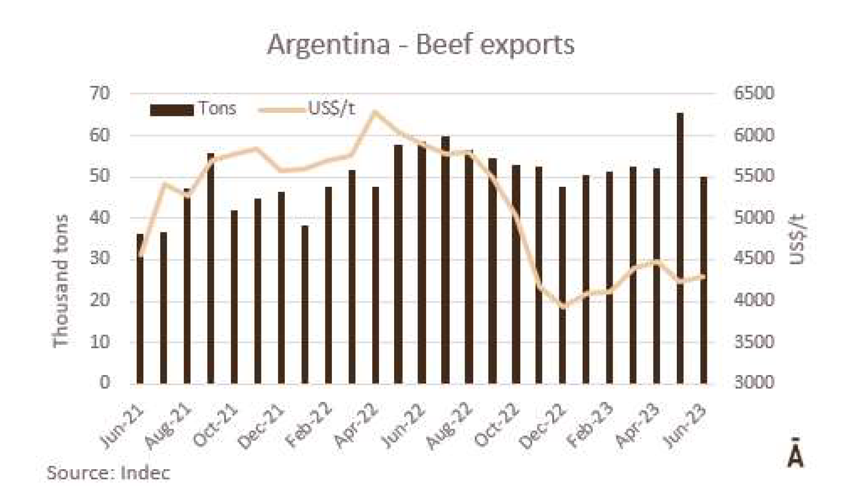 6月份冰鮮、冷凍和加工牛肉的出口總量略高于5萬(wàn)噸(4.1萬(wàn)噸肉和0.9萬(wàn)帶骨肉)。根據(jù)統(tǒng)計(jì),這是2023年迄今為止的最低月產(chǎn)量,比去年5月低24%,比6月低15%。SENASA衛(wèi)生服務(wù)部門的數(shù)據(jù)顯示六月份出口量比5月高,差異“主要是運(yùn)往中國(guó)的數(shù)量上,實(shí)際上比預(yù)計(jì)少1萬(wàn)噸?!?/span> 據(jù)美國(guó)廣播公司報(bào)道,“牛肉屠宰和生產(chǎn)一直處于高水平,6月份出口量的意外下降,主要是由于在支付國(guó)外運(yùn)費(fèi)方面出現(xiàn)了困難。就貨值而言,6月份的出口額接近2.15億美元,比上月降低22.5%,比去年的3.46億美元降低了38%。