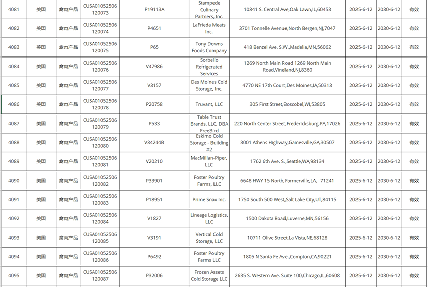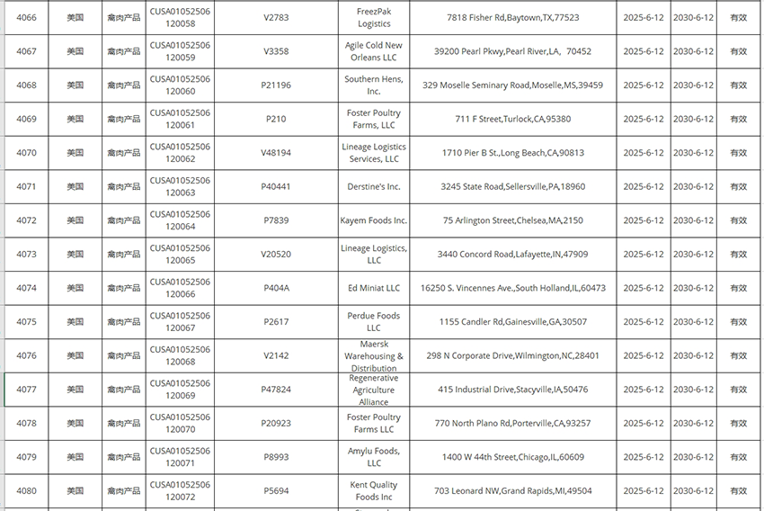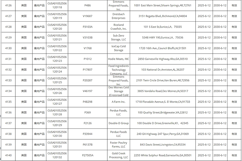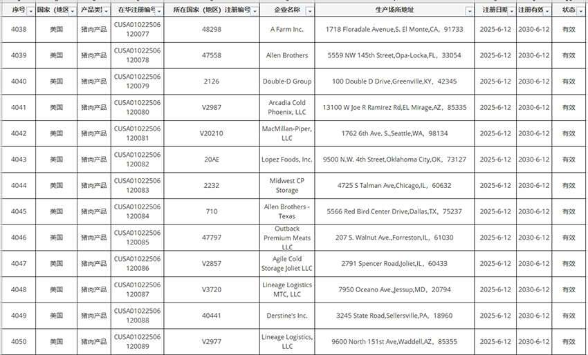 新增美國(guó)豬肉、禽肉企業(yè)自2025年6月12日及之后生產(chǎn)的符合中國(guó)要求的肉類產(chǎn)品輸華。其中83家禽肉企業(yè),23家豬肉企業(yè)。
