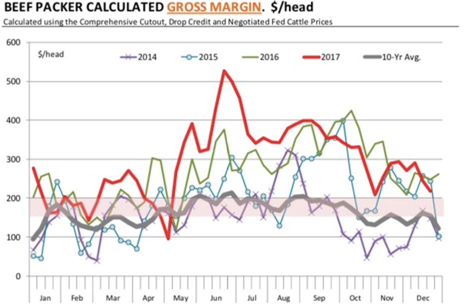 下附兩張圖表描繪了貿(mào)易商在開年的利潤率的不同情況。牛肉貿(mào)易商的利潤率在很大程度上被壓縮到今年年初,部分原因是寒冷的天氣對牛群的影響。在2017年,牛肉貿(mào)易商的利潤率非常好,對2018年的利潤率也仍然保持十分穩(wěn)健的預(yù)期。但是通常一季度的利潤都很低,今年也不會是個例外。當(dāng)所有牛肉需求呈良好態(tài)勢,牛供應(yīng)將持續(xù)增加,也會驅(qū)動對牛肉分銷服務(wù)的需求。在最近兩周牛肉貿(mào)易商的利潤率被擠壓,我們認(rèn)為2017的最后一周的利潤率非常接近于盈虧平衡點(diǎn)。如果精選級牛部位肉價格保持在205美元這個范圍,貿(mào)易商會支付120美元去買牛,剩下的也就接近盈虧平衡,而沒有賺到一點(diǎn)錢。生豬貿(mào)易商在開年的利潤率通常都很高。假期縮短的周數(shù)往往使生豬利潤率延遲,在開年會有一個很大的需求,而這個需求伴隨著市場積壓庫存的清空。寒冷的天氣并沒有對生豬造成多大損失, 因為都被移置于室內(nèi)喂養(yǎng),牛的情況也是如此。在產(chǎn)品方面,貿(mào)易商也非常頭疼節(jié)后后腿需求的暴跌。在這種情況下,生產(chǎn)商會為了保持生豬的流通運(yùn)轉(zhuǎn)而提供給貿(mào)易商一個足夠大的利潤空間。這個庫存積壓的問題往往能被相當(dāng)快的解決。在1月的下半月我們應(yīng)該會看到一個更加正常的市場狀態(tài)。接下來的挑戰(zhàn)是豬肉在國內(nèi)和國外渠道中的需求。期貨市場現(xiàn)在的價格走勢呈現(xiàn)出了在這個冬季和早春對豬肉的積極需求。去年我們看到了對豬部位肉和生豬需求的顯著激增,此趨勢一直持續(xù)到2月。這也很大程度上歸功于豬五花的高位價格。后腿價格最近持續(xù)疲軟,我們正看到更多的產(chǎn)品在現(xiàn)貨市場交易。和墨西哥的貿(mào)易持續(xù)穩(wěn)定,現(xiàn)在較低的后腿價格應(yīng)該能持續(xù)助力外銷。今年冬天期間生豬疾病的壓力是一個問題,一些報告顯示,豬藍(lán)耳病和豬流行性腹瀉病病例在增加。但情況與我們過去兩年看到的情況類似,目前尚未有太多影響。