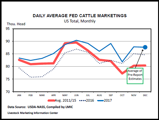 許多分析者預(yù)測12月份進(jìn)入育肥場的育肥牛數(shù)量同比會下降。2016年12月的存欄量是自2010年以來量最大的月份, 最近幾個月的存欄量也一直很大。 然而,如果在報告中會有一個出乎預(yù)料的數(shù)據(jù)的話,應(yīng)該是存欄量會高于報告前預(yù)測的平均水平(只有前一年的96.9%)如果12月的存欄量符合報告前預(yù)測的平均值,在2017年第四季度(10月-12月)進(jìn)入育肥場的??倲?shù)同比增幅7.5%(433,000頭),是2012年以來同期最大量。