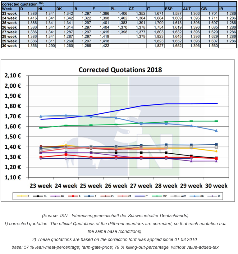 德國的豬價也面臨壓力,豬價下跌3歐分,據(jù)稱是由于假日肉類交易疲軟導致的。德國屠宰量已經(jīng)低于900,000頭,較去年下降很明顯。歐洲南部地區(qū)豬價沒有明顯下降,意大利和西班牙假期需求增加。