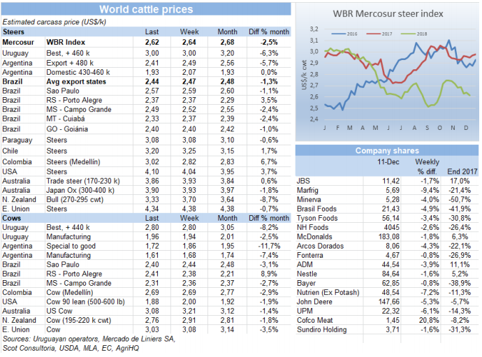 南方共同市場閹牛價格本周跌了2美分到2.62美金,主要是貨幣疲軟導(dǎo)致。全球的不確定因素對南美地區(qū)貨幣造成了影響,巴西雷亞爾貶值1.9%,阿根廷比索貶值2.4%,雖然巴西本地牛價漲了1雷亞爾,美金牛價還是降低了3美分到2.44美金,阿根廷本地牛價也因為歐洲市場低迷而有所下跌,美金牛價跌了8美分到2.41美金。巴拉圭和烏拉圭牛價穩(wěn)定在3.08和3美金。